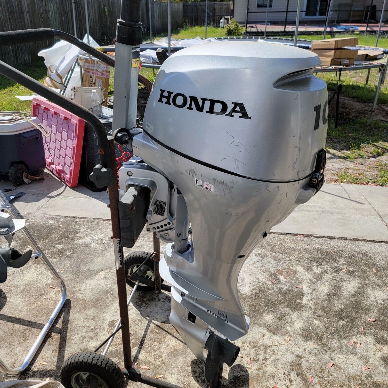 Honda BF10 10HP 4-stroke outboard motor with 222cc displacement. Lightweight and fuel-efficient. Needs carburetor rebuild. Sold as shown.